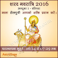 शारदीय नवरात्रि आज से आरम्भ हो रही है, जो 10 अक्टूबर 2016 को समाप्त होगी। इस नवरात्रि में एस्ट्रोसेज ख़ास ऑफ़र के साथ लाया है शारदीय नवरात्रि 2016 की पूजाविधि एवं शुभ मुहूर्त।